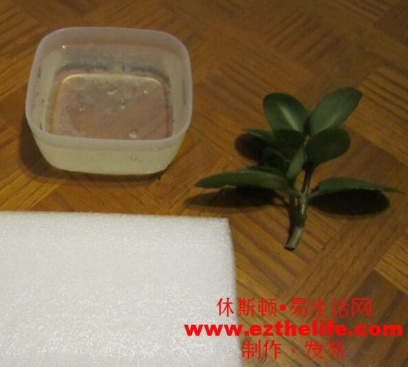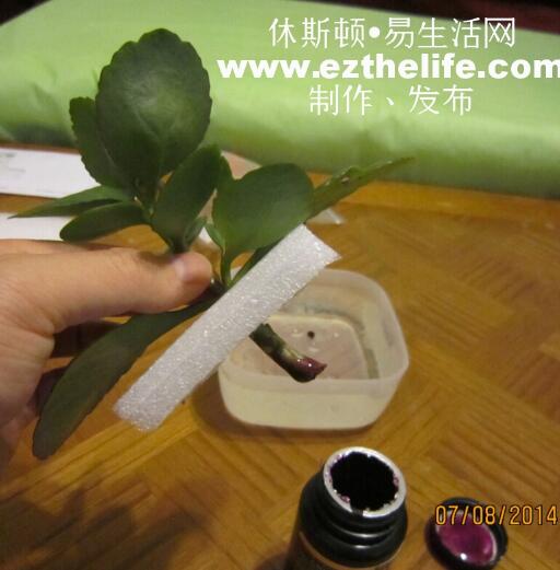 将做好的所料泡沫涛入植物低端约4厘米以上,即泡沫下端无叶子,只有茎部和生根剂。将只做好的植物插入盛有水的容器中。