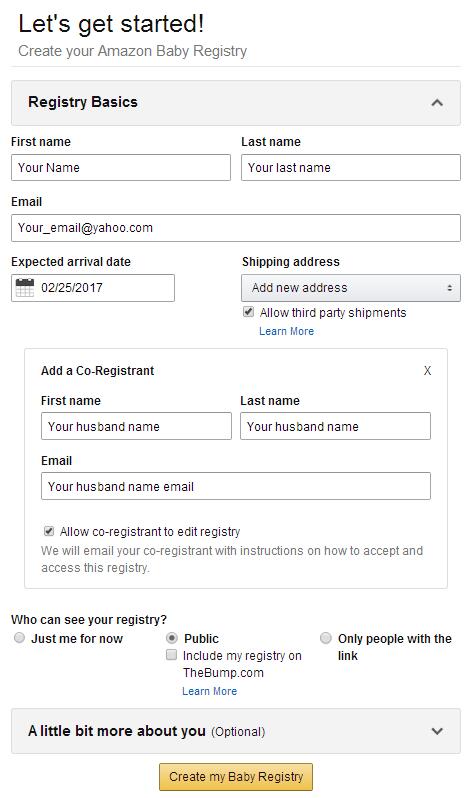 3, 填写注册信息,即你和你先生的姓名,以及宝宝的预产期。我建议设置为公开可见(public),因为宝宝计划的目的就是让亲朋好友知道你想要什么,他们可以买了送给你呀:)。Estimated Arrival Date 是填写宝宝的预产期。这个日期填写要特别注意:按照Amazon baby Registry的规定“折扣的有效期是在baby出生前30天至出生后60天”且“注册baby Registry之后14天才可以享受折扣”