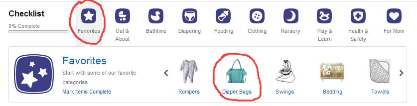 2,我们以Favorites类为例,介绍怎么使用宝宝计划。点击Favorties后,出行下拉产品列表,点击Diaper bag,就可以选尿布包了。