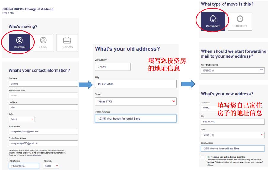 填写您自己的姓名,联系方式,投资房地址,自家住址等信息。