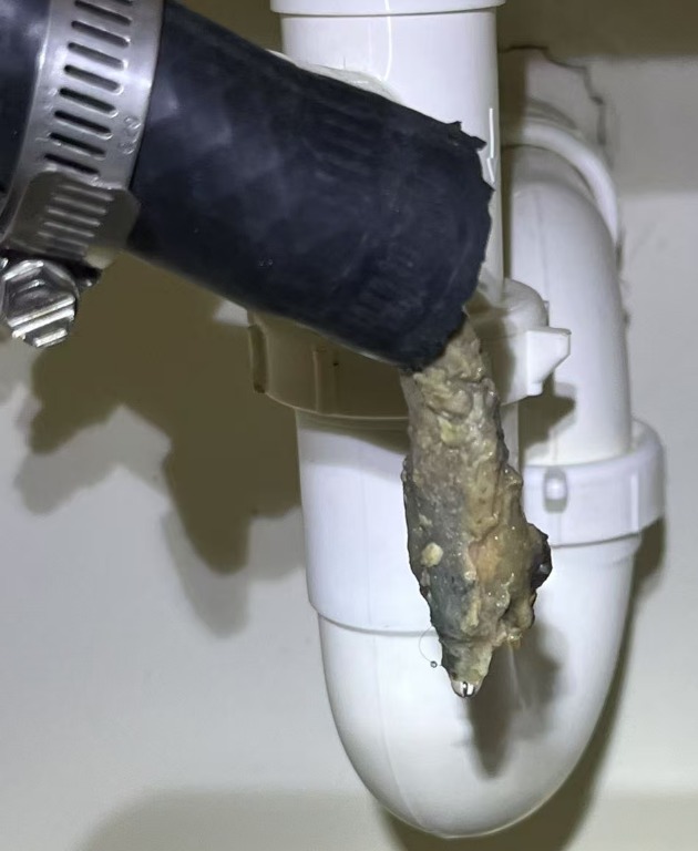 许多租客未定期维护空调,导致冷凝水管堵塞, 请看信达空调处理过的真实堵塞。