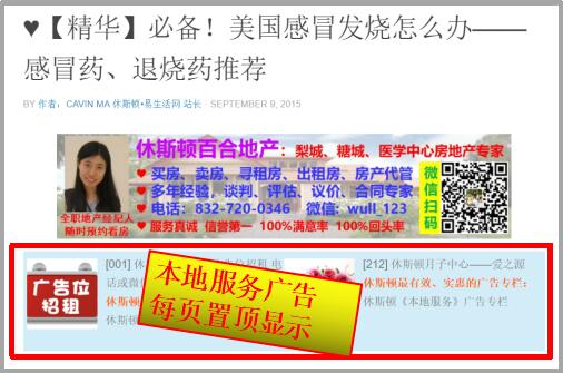 3,【有效】我们的广告不仅在首页显示,而且在每个文章顶部广告栏也显示。读者们无论读本站哪个文章,首选看到的就是本地服务的广告。例如: